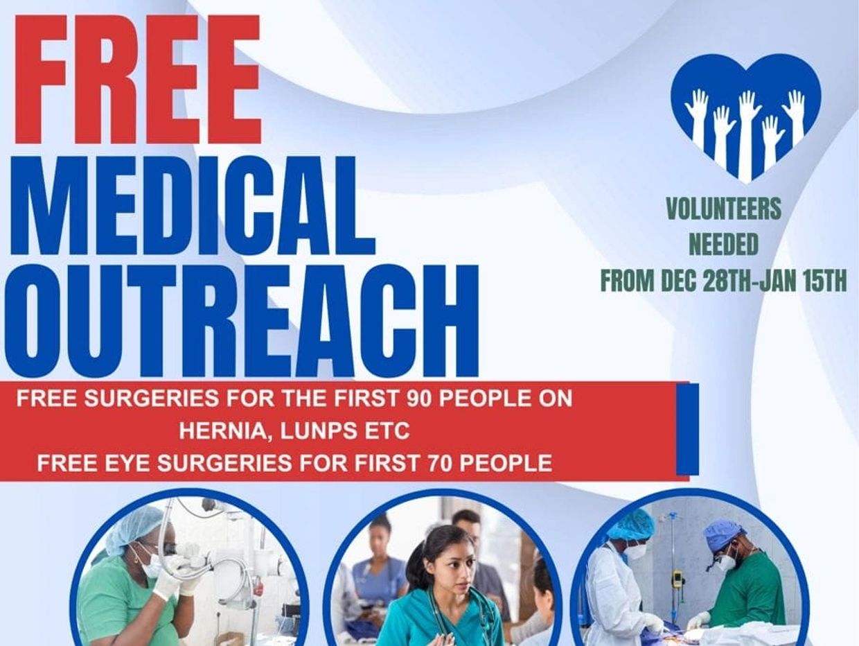 The first 90 general surgery patients with hernia, appendix, lumps, etc., and the first 70 eye surgery patients, will receive free care.